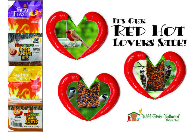 Just in time for Valentine's Day, save on all our hot pepper foods! Birds love them because the squirrels don't, which means more food for the birds! That's right, birds don't hve the same taste receptors as mammals have - what's too hot for squirrels is all yummy goodness for birds!